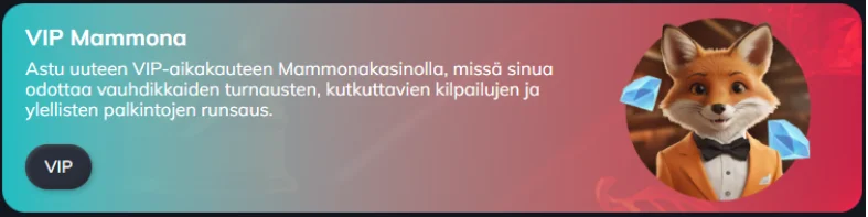 Mammona Kasinon VIP-ohjelma on suunnattu pelaajille, jotka viihtyvät kasinolla pidempään ja arvostavat henkilökohtaista palvelua. Ohjelman edut mukautetaan pelaajan aktiivisuuden mukaan, mikä tuo pientä yllätyksellisyyttä ja lisäarvoa ilman jatkuvaa kampanjatulvaa.