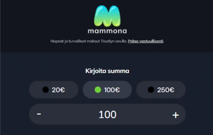 Mammona Kasino on puhdas Pay’n Play pikakasino, eli kaikki rahansiirrot hoituvat suoraan verkkopankin kautta Trustlyn avulla. Pelaaminen, talletukset ja kotiutukset kulkevat samalla nopealla ja turvallisella polulla, ilman kortteja, e-lompakoita tai rekisteröitymislomakkeita.