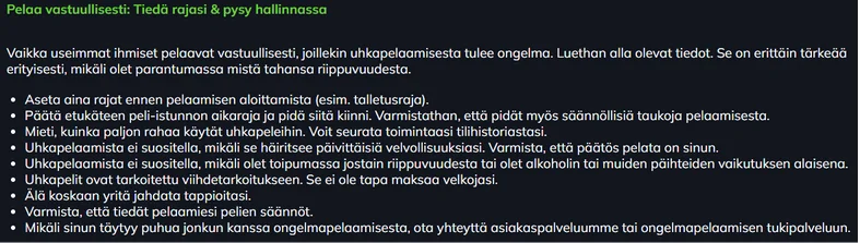Mammona Kasino suhtautuu vastuulliseen pelaamiseen vakavasti ja tarjoaa pelaajille useita työkaluja oman pelaamisen hallintaan. Tavoitteena on, että pelaaminen pysyy viihteenä, eikä se aiheuta ongelmia arjessa.