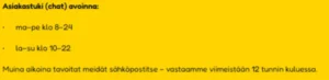 Live chat | ma-pe 8-24 | Suomi | Vastausaika noin 30s |